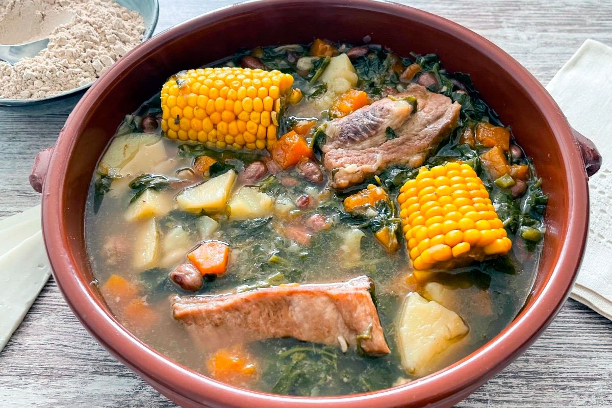 It is traditionally served with gofio, which is mixed with a little of the soup broth until it forms a smooth dough.